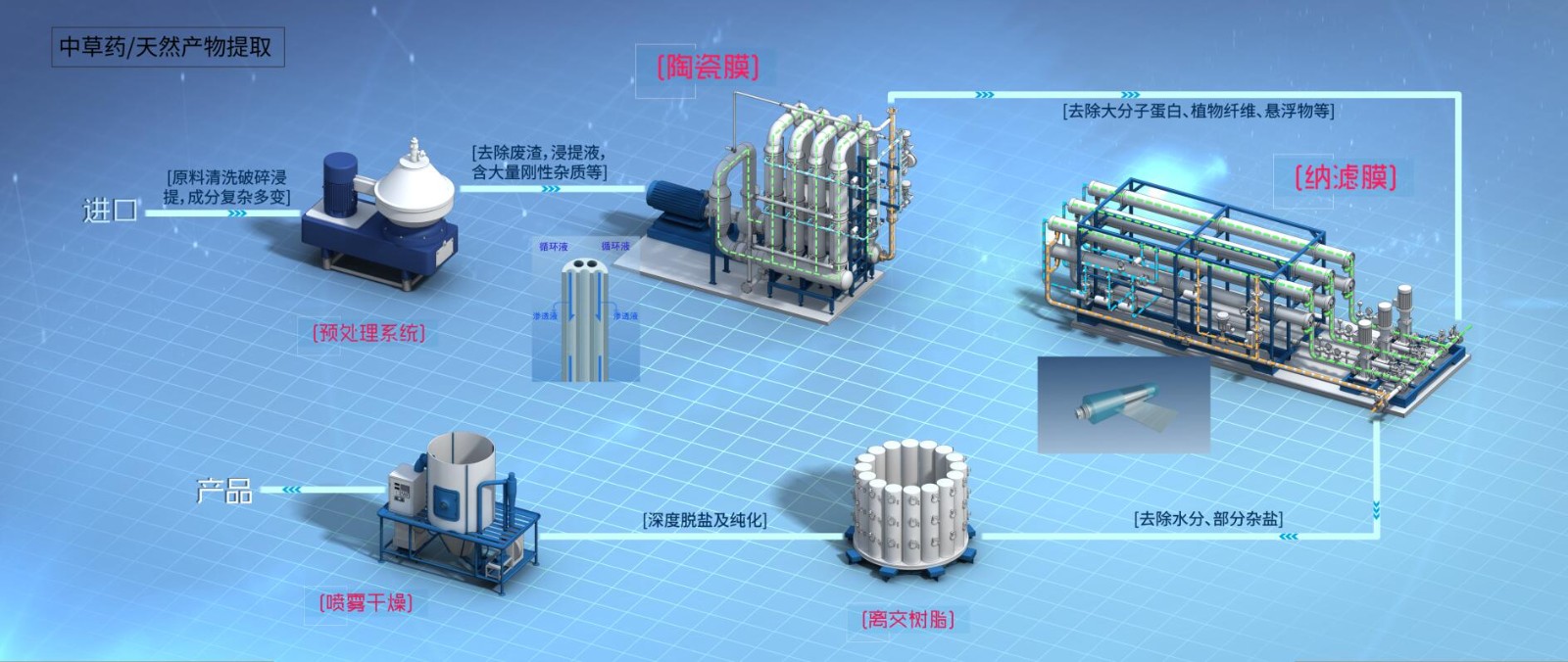 食品與飲料、天然產(chǎn)物的初始料液成分復(fù)雜,:形⑸、纖維、鞣質(zhì)、油脂、色素、無機(jī)鹽、酚類、蛋白質(zhì)、果膠等雜質(zhì),傳統(tǒng)過濾提純工藝難以有效去除雜質(zhì)或純化產(chǎn)品,膜集成技術(shù)整體解決方案能夠有效利用膜材料和樹脂等與天然產(chǎn)物分子量和電荷等的匹配性,對有效成分進(jìn)行選擇及富集,從而實(shí)現(xiàn)產(chǎn)品的過濾、分離與純化,提高產(chǎn)品質(zhì)量和收率,降低運(yùn)營成本并維護(hù)人類健康。